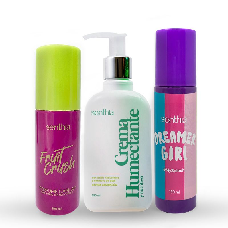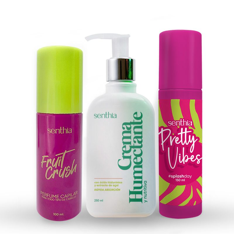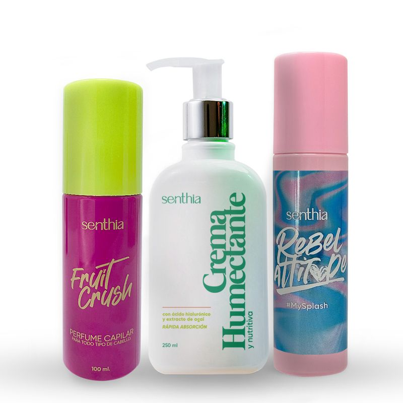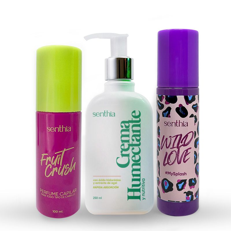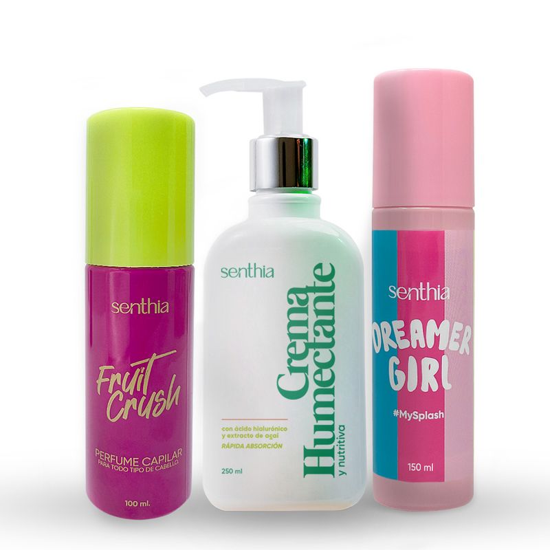 Descubre el Kit Senthia, creado para que tu aroma hable por ti. Una combinación perfecta de cuidado y fragancia que te acompaña en cada momento del día. Este kit incluye una Crema Neutra humectante, un Perfume Capilar nutritivo y un Body Splash — elige entre nuestras irresistibles fragancias y crea tu propia historia aromática.